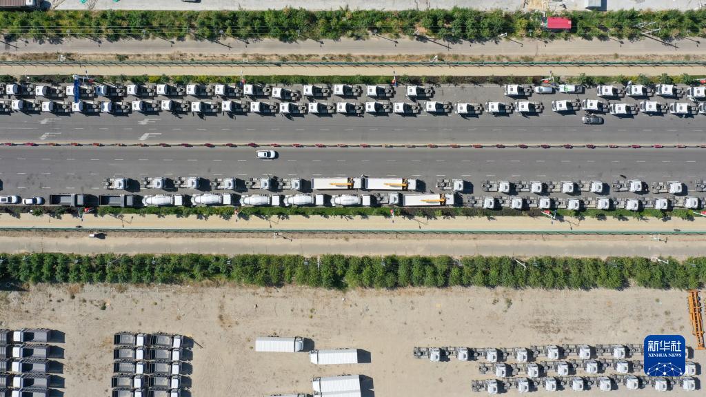 國產商品車排隊進入新疆霍爾果斯綜合保稅區(7月26日攝,無人機照片)。