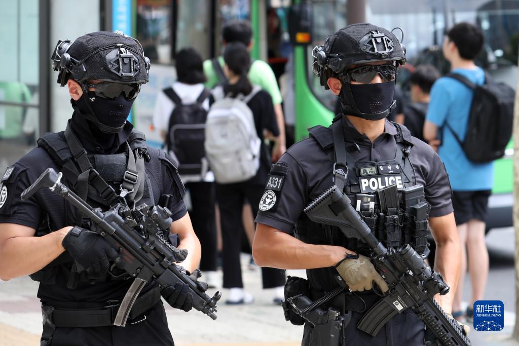 8月6日,全副武裝的特警在韓國首爾江南區(qū)街頭巡邏。