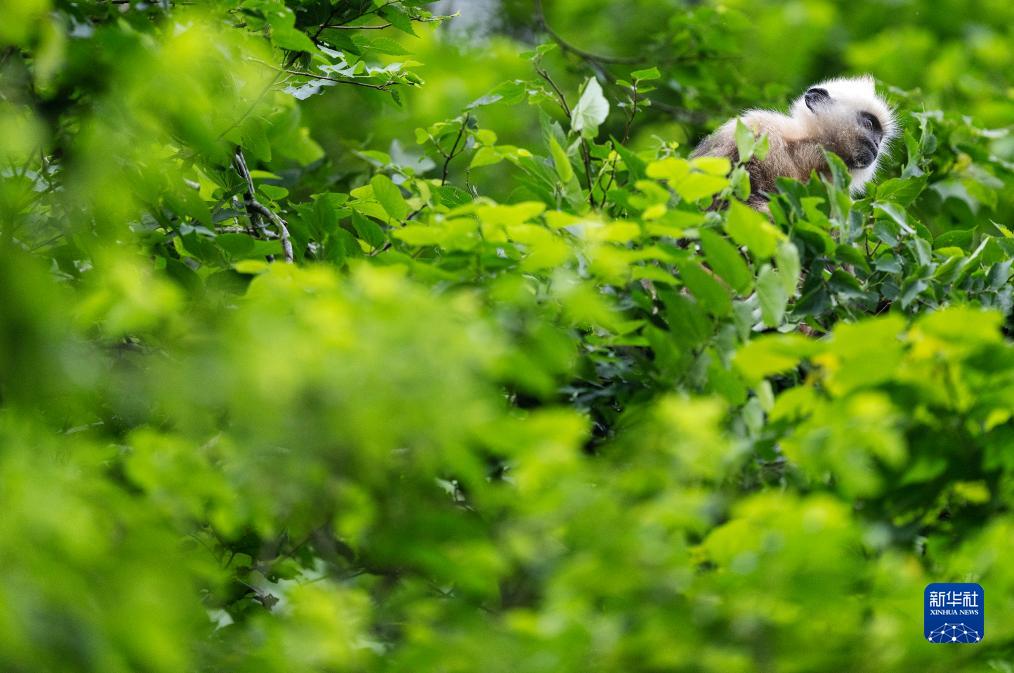 一只白頭葉猴在樹林中覓食(8月5日攝)。