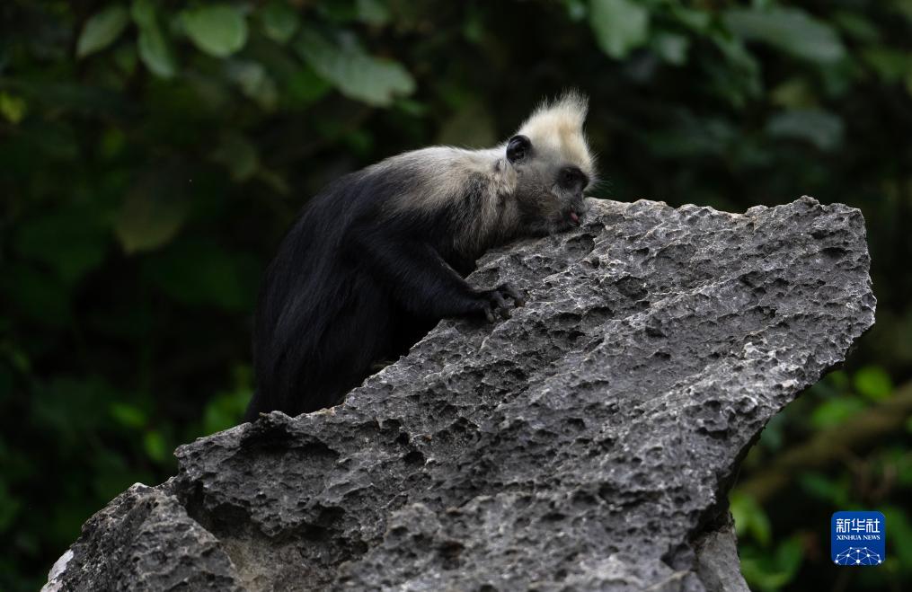 白頭葉猴,頭頂高聳著一撮白毛,是我國特有的國家一級重點保護(hù)野生動物,種群數(shù)量稀少,主要分布在廣西崇左市左江和明江之間約200平方公里的喀斯特石山地區(qū)。白頭葉猴還有個好聽的名字——“石山精靈”。