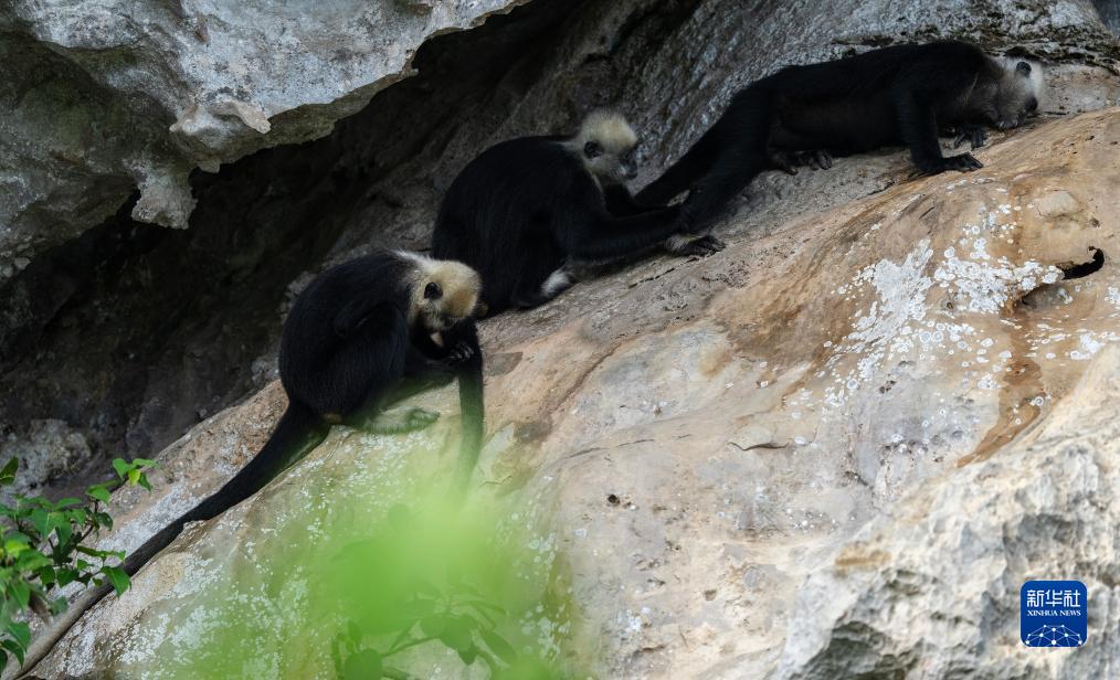 白頭葉猴,頭頂高聳著一撮白毛,是我國特有的國家一級重點保護野生動物,種群數量稀少,主要分布在廣西崇左市左江和明江之間約200平方公里的喀斯特石山地區。白頭葉猴還有個好聽的名字——“石山精靈”。