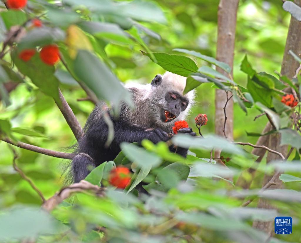一只白頭葉猴在吃構(gòu)樹的果實(shí)(8月4日攝)。