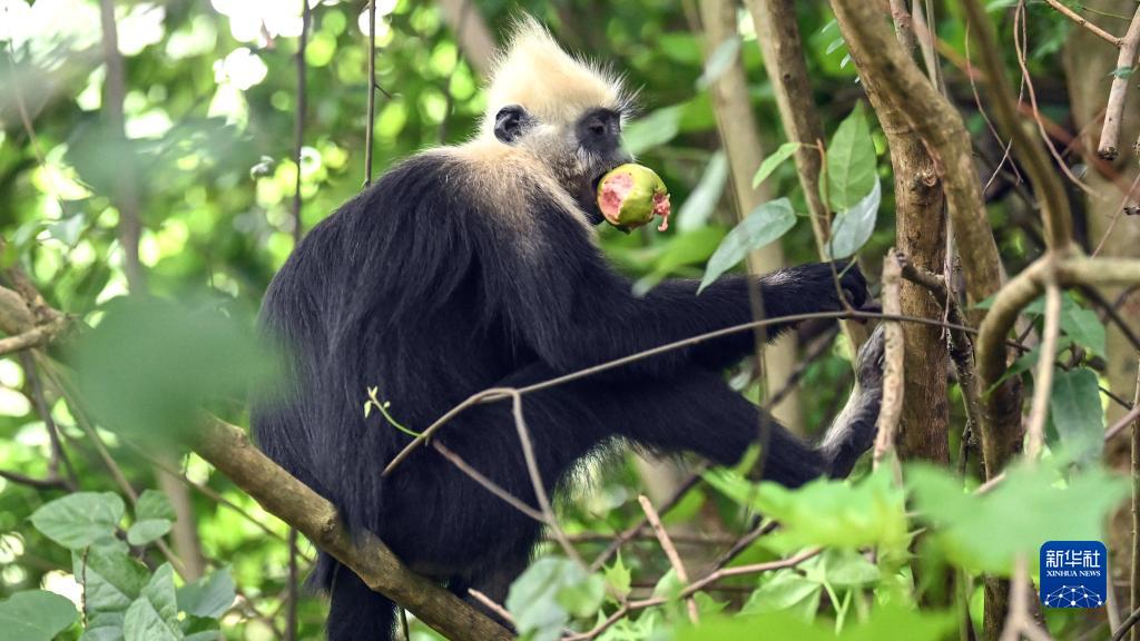一只白頭葉猴在吃番石榴(8月4日攝)。