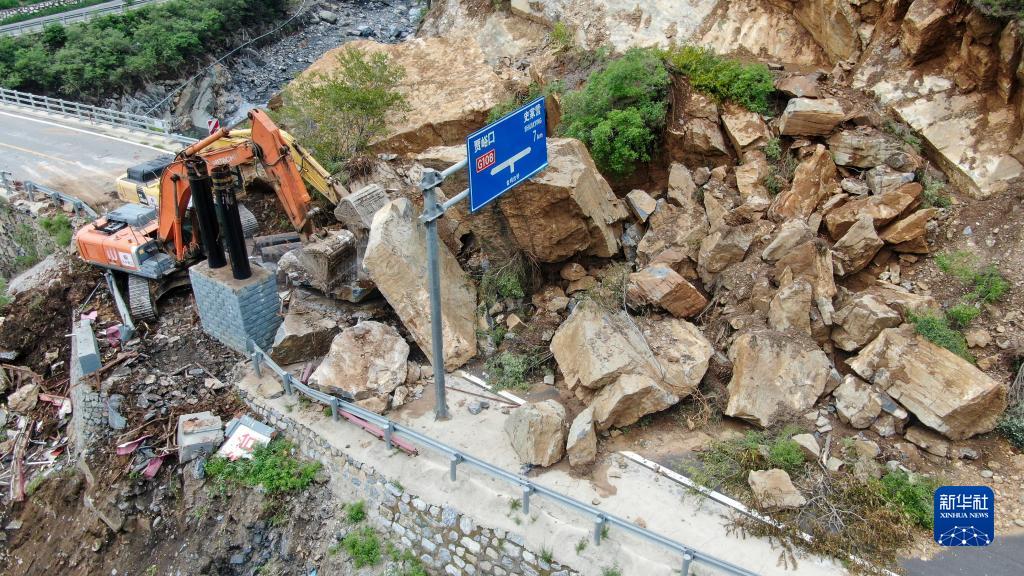 8月6日,在北京市房山區史家營鄉金雞臺村附近,北京建工機施集團的大型機械設備在清理阻斷道路的落石(無人機照片)。