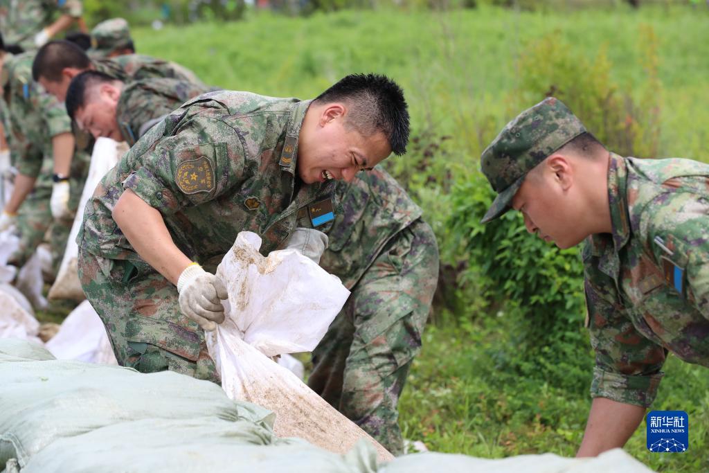 北部戰區空軍航空兵某旅組織官兵在黑龍江省牡丹江市牡丹江沿岸搬運沙袋加固堤壩(8月5日攝)。