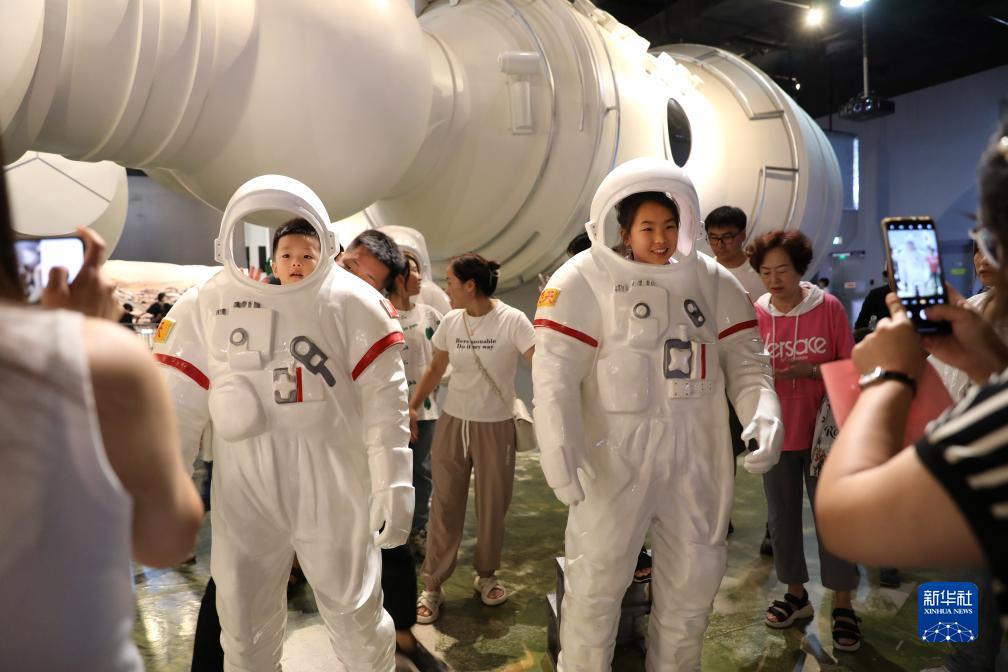 8月6日,小朋友們在位于沈陽市的遼寧省科技館里航天展區參觀留影。