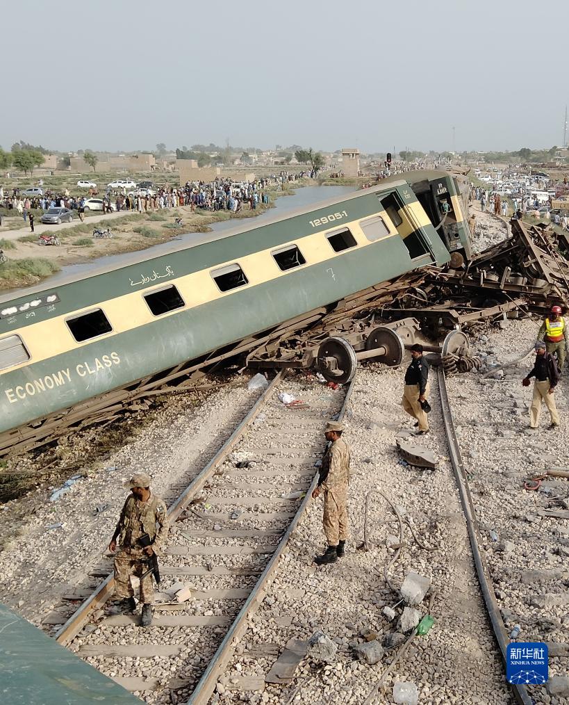 這是8月6日拍攝的巴基斯坦南部信德省桑克爾地區(qū)列車脫軌事故現(xiàn)場。
