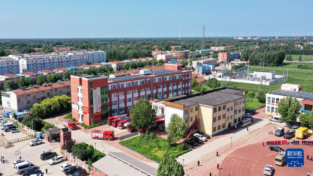 8月6日,在平原縣王打卦中心小學,應急救援隊伍集結待命(無人機照片)。