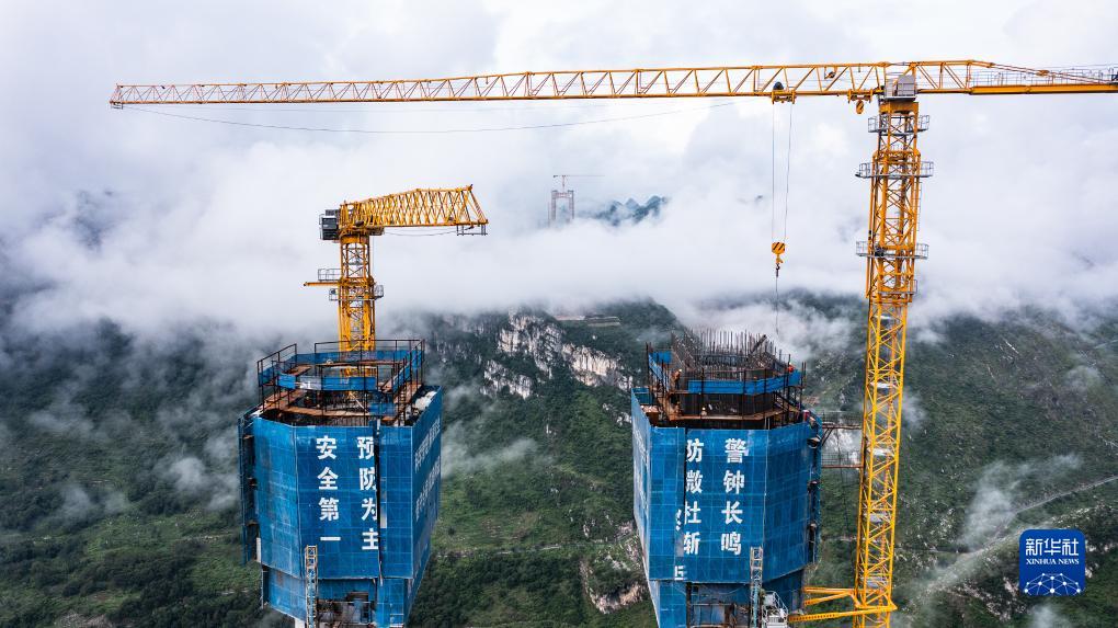 正在修建中的花江峽谷大橋5號主塔(8月3日攝,無人機照片)。