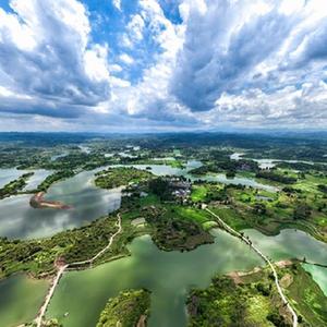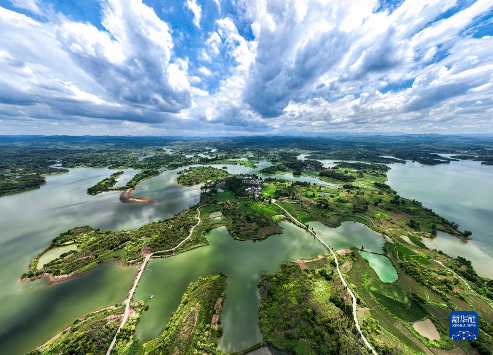 8月6日,湖南桂陽舂陵國家濕地公園,綠水、濕地、藍天相映成趣,構成一幅秀美的夏日生態畫卷(無人機照片)。