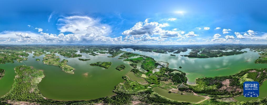 8月6日,湖南桂陽舂陵國家濕地公園,綠水、濕地、藍天相映成趣,構成一幅秀美的夏日生態畫卷(無人機全景照片)。