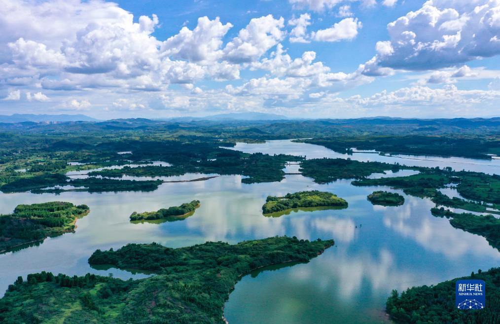 8月6日,湖南桂陽舂陵國家濕地公園,綠水、濕地、藍天相映成趣,構成一幅秀美的夏日生態畫卷(無人機照片)。