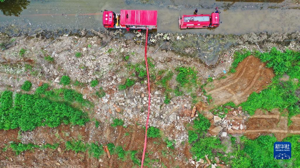 8月7日,保定市消防救援支隊(duì)排水設(shè)備在河北省涿州市林家屯鎮(zhèn)梁家墳村進(jìn)行排澇作業(yè)(無人機(jī)照片)。