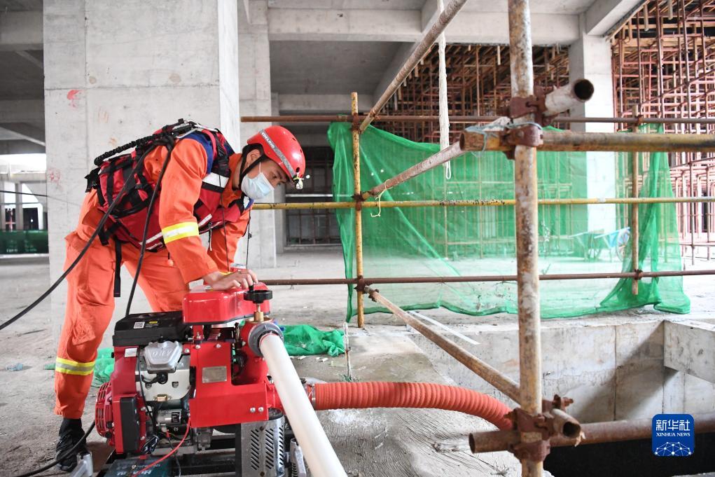 8月7日,邢臺市消防救援支隊隊員在河北省涿州市一處工地進行排澇作業。