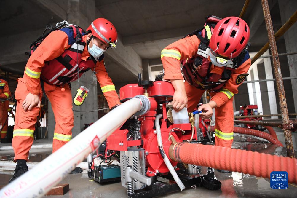 8月7日,邢臺市消防救援支隊隊員在河北省涿州市一處工地進行排澇作業。