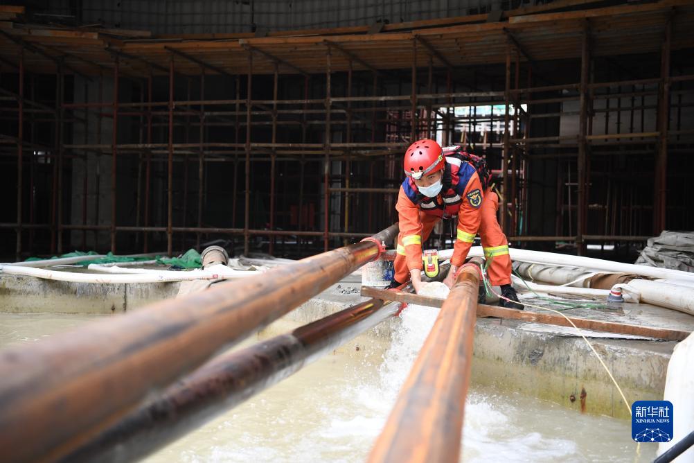 8月7日,邢臺市消防救援支隊隊員在河北省涿州市一處工地進行排澇作業。