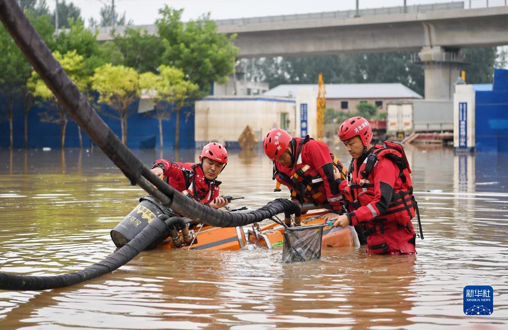 8月7日,唐山市消防救援支隊隊員在河北省涿州市市區內進行排澇作業。