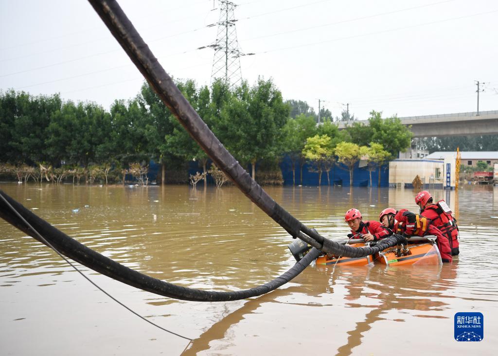 8月7日,唐山市消防救援支隊(duì)隊(duì)員在河北省涿州市市區(qū)內(nèi)進(jìn)行排澇作業(yè)。