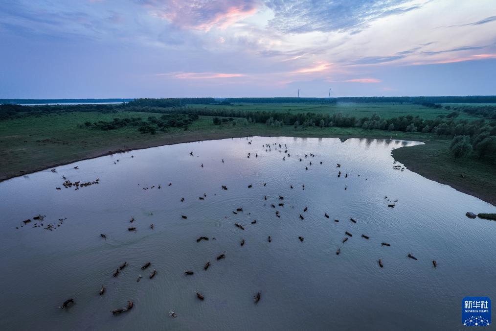 7月31日,一群麋鹿在湖北石首麋鹿國(guó)家級(jí)自然保護(hù)區(qū)內(nèi)活動(dòng)(無(wú)人機(jī)照片)。