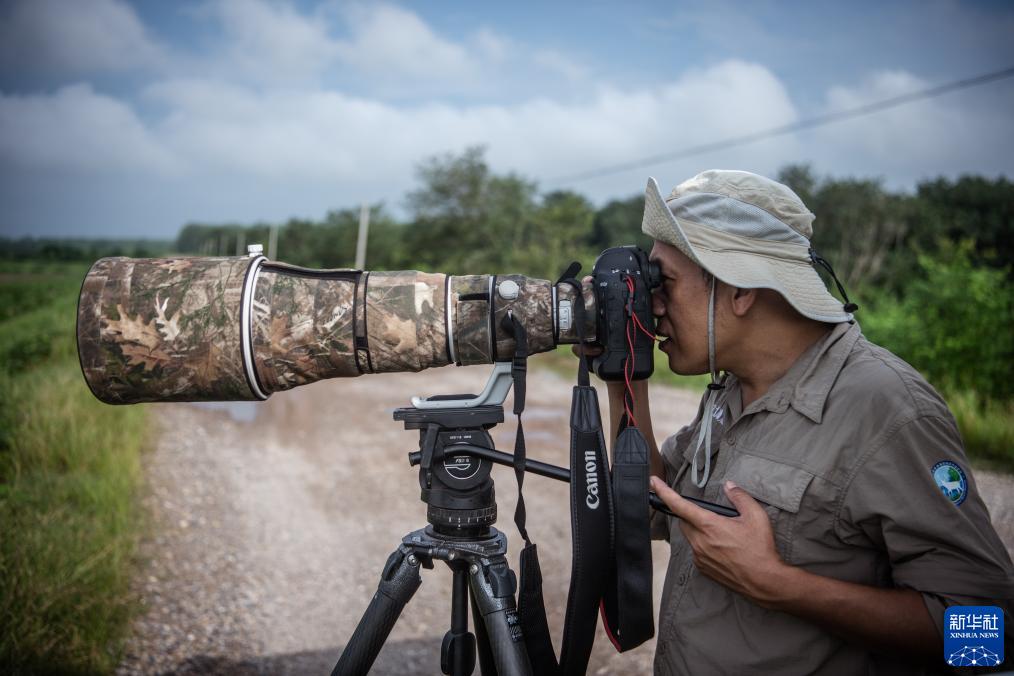 8月2日,在湖北石首麋鹿國家級自然保護區,工程師張玉銘使用相機拍攝遠處的麋鹿群。