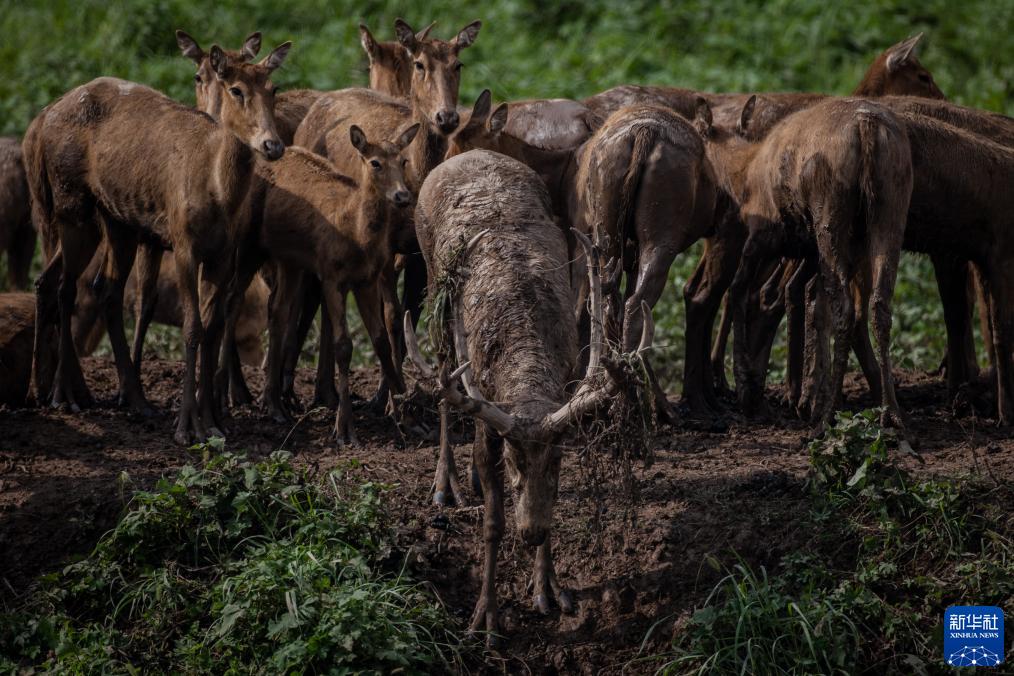 每年6-8月是保護區內麋鹿的發情期。每到這時,雄性麋鹿會用鹿角挑掛青草、在身上涂滿泥漿,大聲吼叫,以此獲得雌鹿的青睞。為了爭奪交配權,處于發情期的雄鹿之間常常會爆發激烈“爭斗”,并各自圈出多個繁殖群體,每個群體由一頭鹿王和多頭雌鹿及幼鹿組成,數量不等。