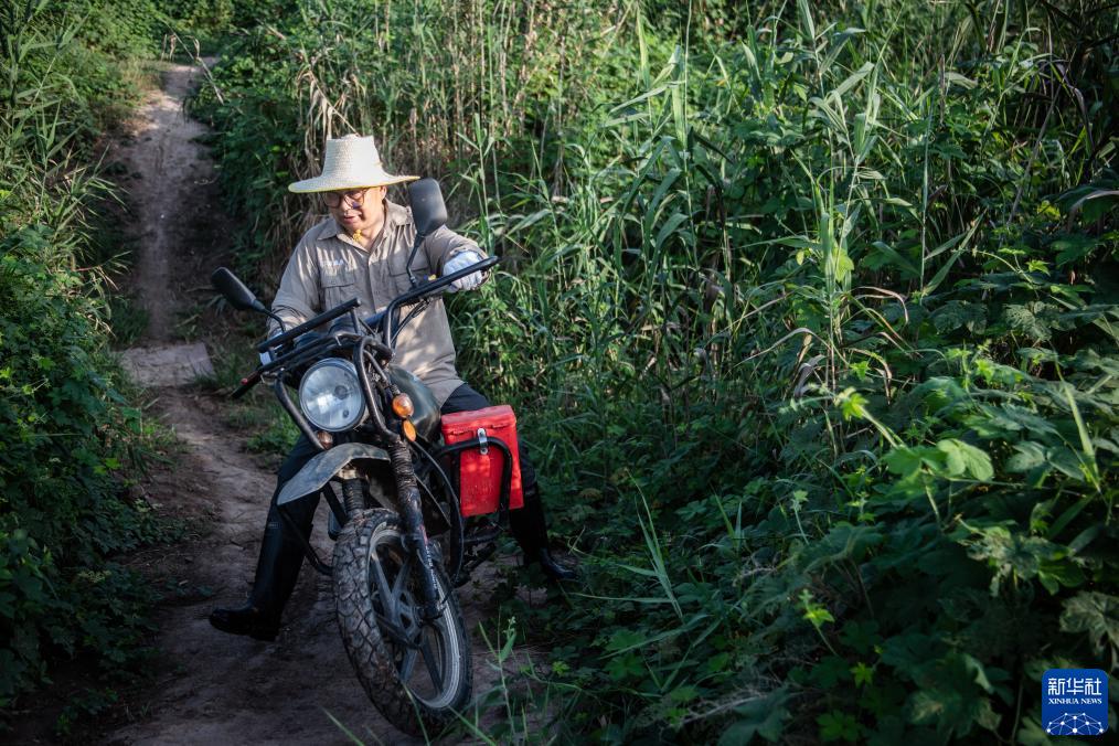 8月1日,在湖北石首麋鹿國家級自然保護區,巡護員王傳軍在騎車巡邏途中駛過坑道。