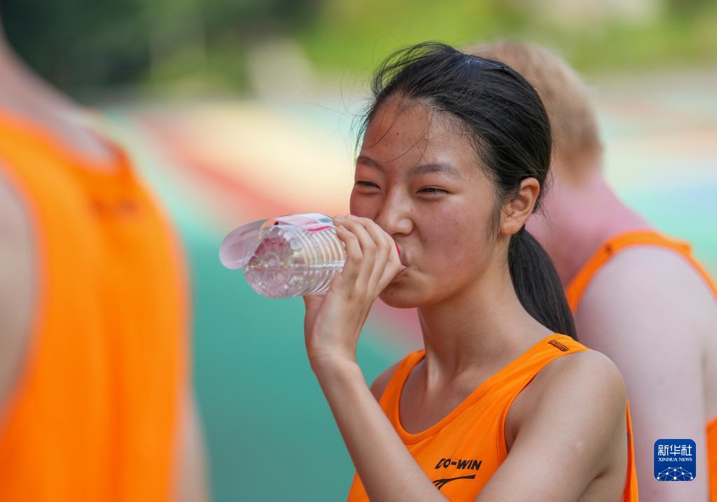 8月4日,重慶市特殊教育中心田徑隊(duì)隊(duì)員蔣雯雯在訓(xùn)練間隙喝水。
