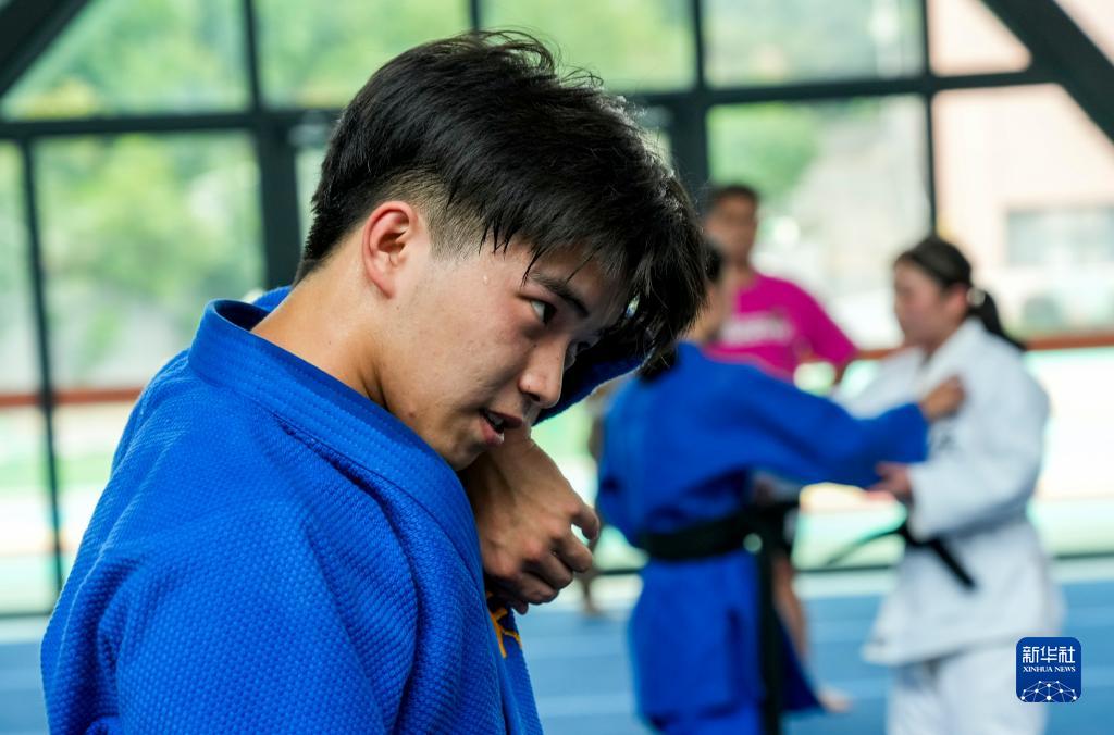 8月4日,重慶市特殊教育中心柔道隊隊員周涵訓(xùn)練間隙擦汗。