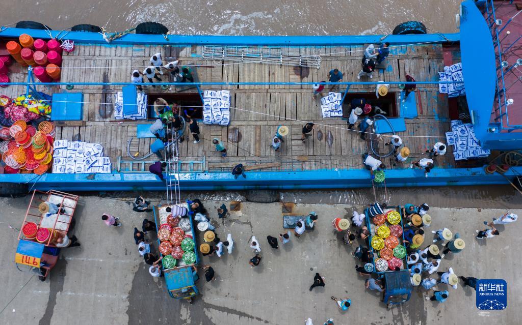 8月7日首批開漁歸來的漁運船靠泊在舟山普陀沈家門舟山國際水產(chǎn)城碼頭,吸引了大批海鮮批發(fā)商前來選購新鮮的梭子蟹等漁獲(無人機照片)。