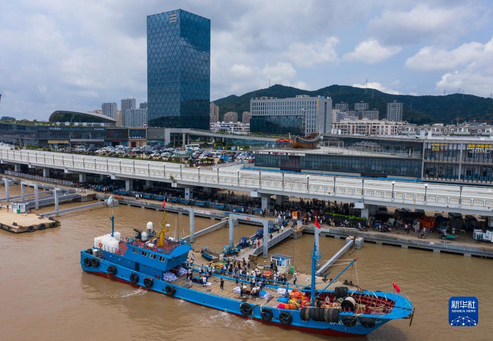 8月7日首批開漁歸來的漁運船靠泊在舟山普陀沈家門舟山國際水產城碼頭,吸引了大批海鮮批發商前來選購新鮮的梭子蟹等漁獲(無人機照片)。