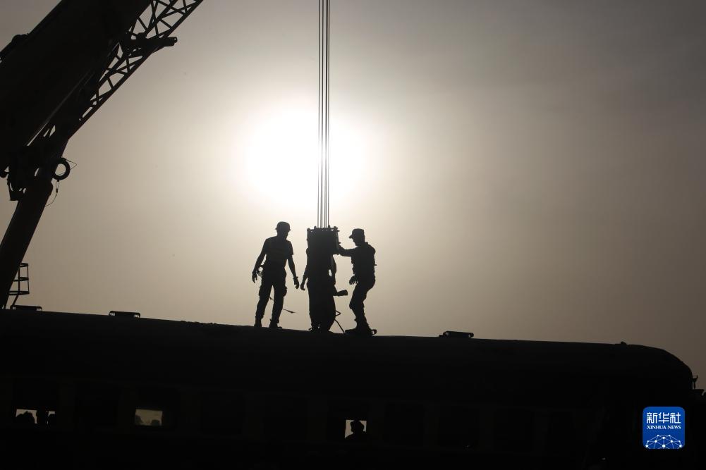 8月6日,救援人員在巴基斯坦南部信德省桑克爾地區(qū)的列車脫軌事故現(xiàn)場(chǎng)工作。