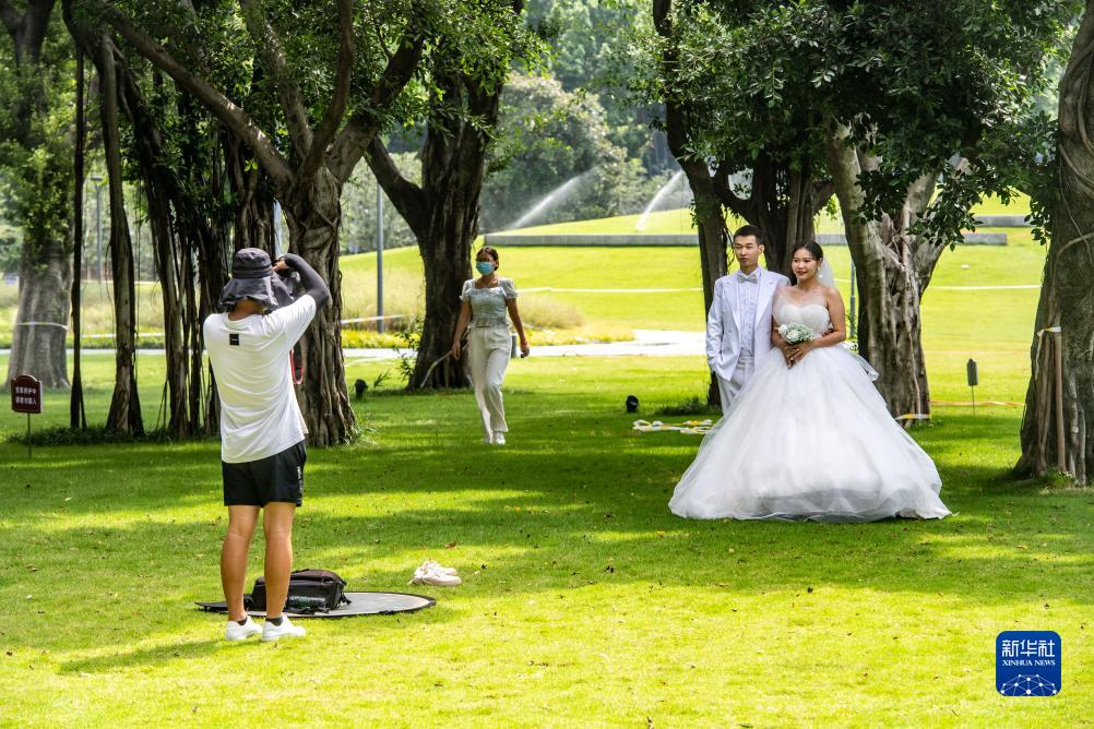 8月6日,在位于重慶長江岸邊的珊瑚公園,新人在拍攝婚紗照。