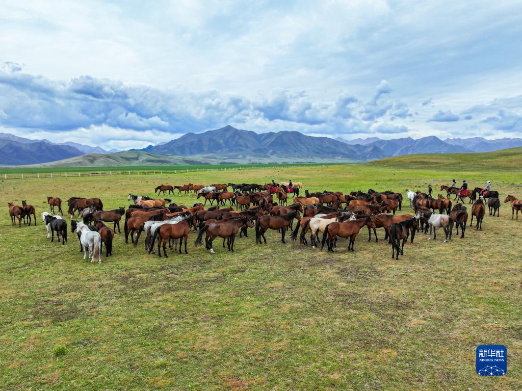 這是8月6日在山丹馬場一場有限責任公司拍攝的馬群(無人機照片)。
