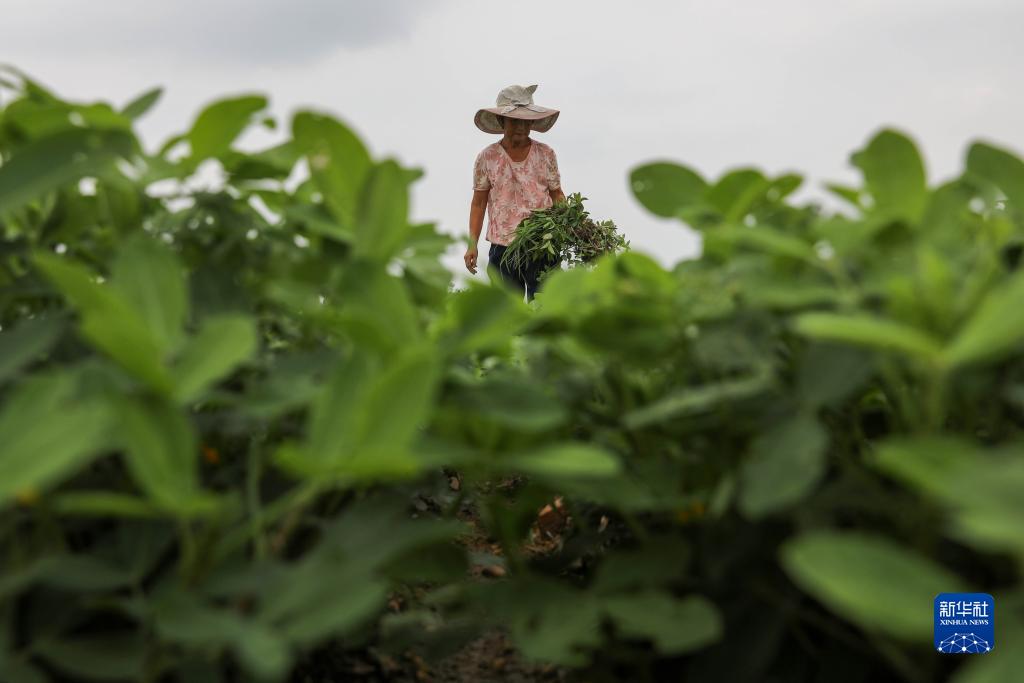 8月7日,在河南省寶豐縣張八橋鎮東火山村一處花生地,農民在田間除草。