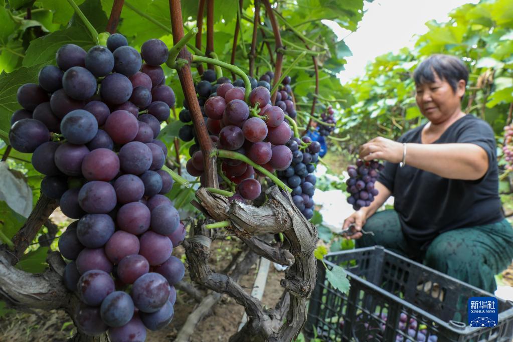 8月7日,在河南省寶豐縣張八橋鎮袁店村一處葡萄種植園,農民在采摘葡萄。