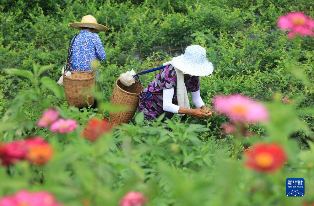 8月7日,在湖南省張家界市武陵源區金杜村莓茶種植基地,茶農在采摘鮮葉。