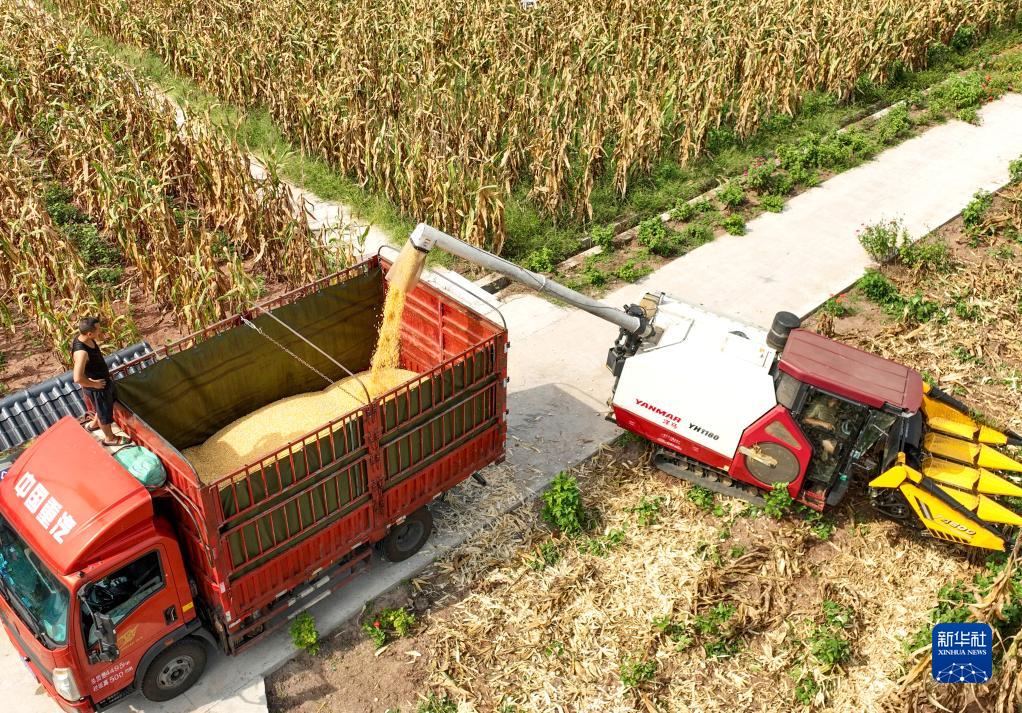 8月6日,在四川省華鎣市永興鎮(zhèn)大佛山村,收割機在收獲玉米。