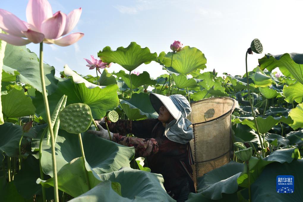 8月7日,在湖南省衡陽市衡東縣高湖鎮新興垅村,村民在荷田中采摘蓮蓬。