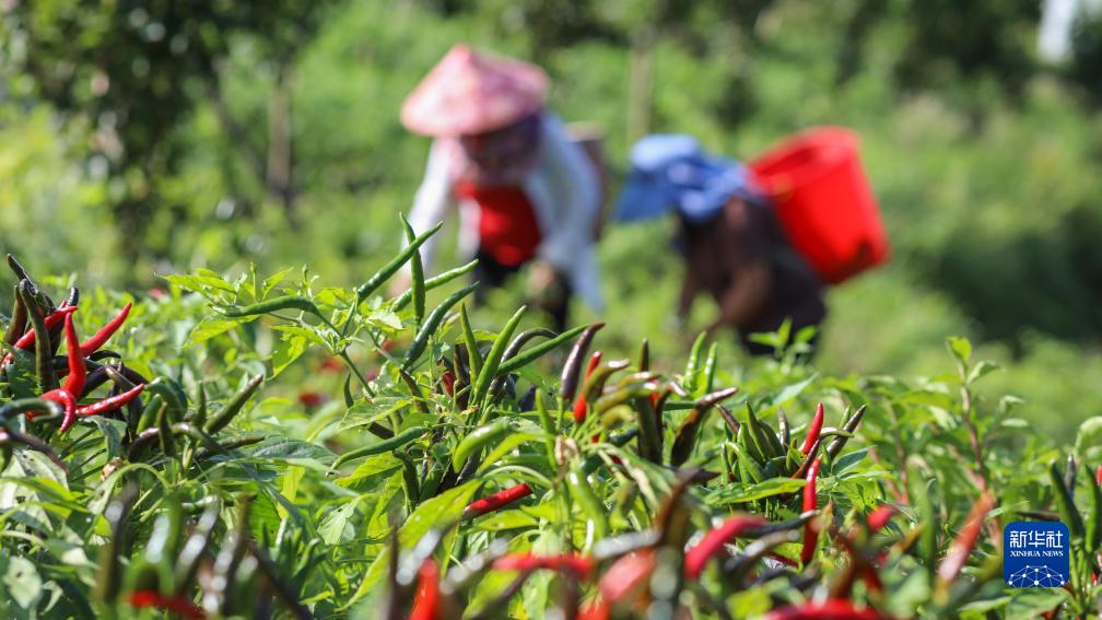 8月7日,在貴州省劍河縣南哨鎮(zhèn)九當(dāng)村辣椒基地,村民在采摘辣椒。
