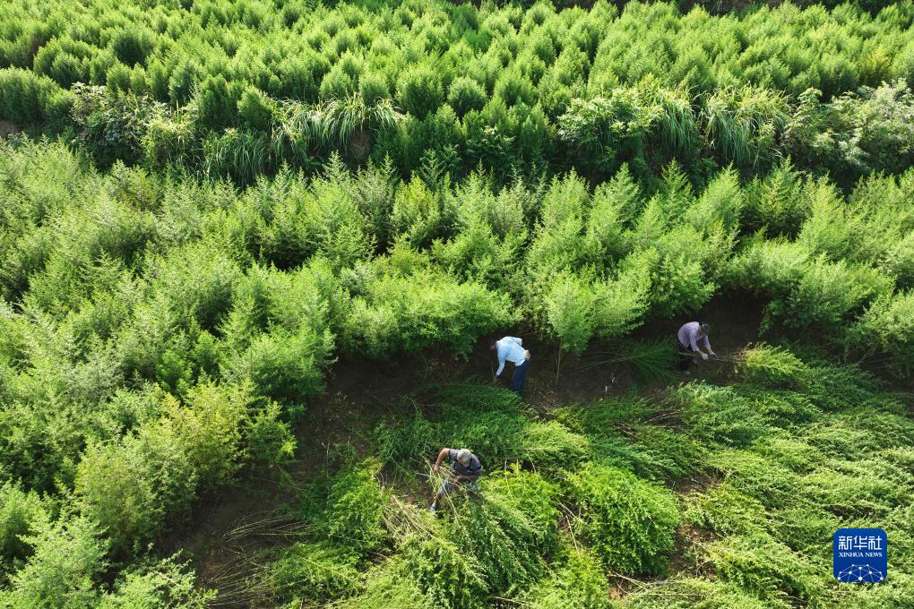 8月7日,在重慶市黔江區黑溪鎮蘇維村,村民在收割青蒿(無人機照片)。
