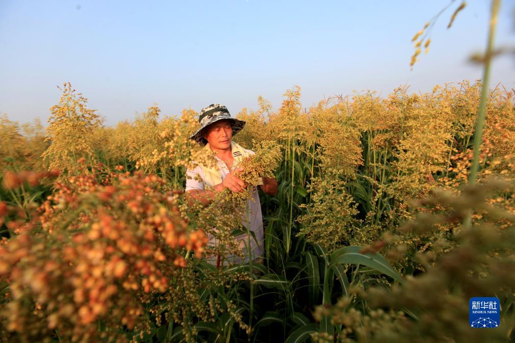 8月7日,在山東省臨沂市平邑縣地方鎮(zhèn)東朱尹村,村民在田間查看高粱長勢。