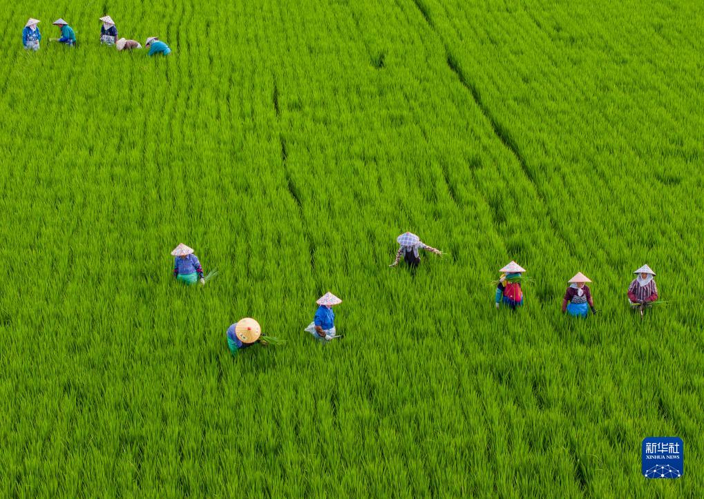 8月7日,在江蘇省昆山市陸家未來智慧田園現(xiàn)代農(nóng)業(yè)園區(qū),村民在水稻田清除雜草(無人機(jī)照片)。