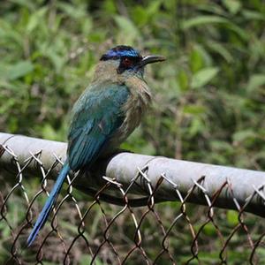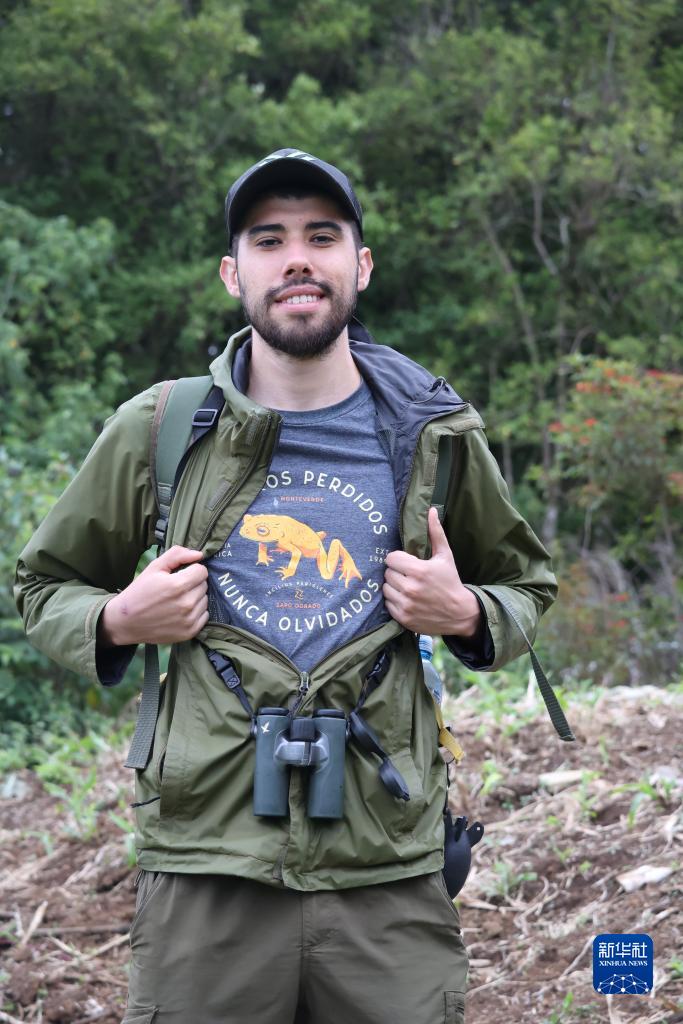 7月23日,哥斯達黎加蒙特韋德云霧森林生物保護區的一名導游展示他身穿的印有金蟾蜍紀念圖案的T恤衫。