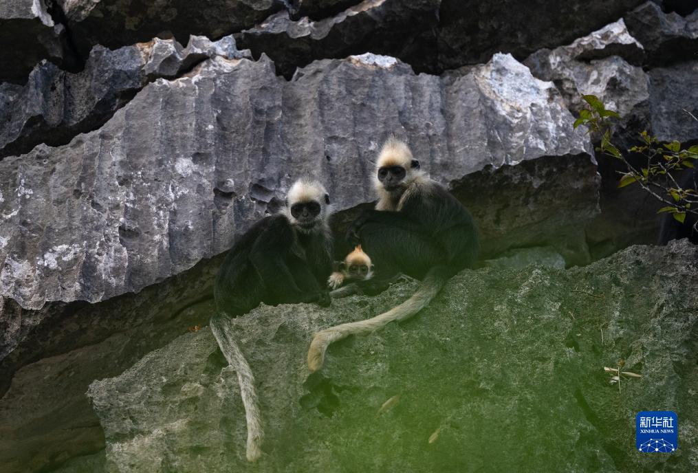 8月5日清晨,兩只母猴保護(hù)著一只小“金猴”。幼猴渾身金毛,被人們稱為“金猴”。