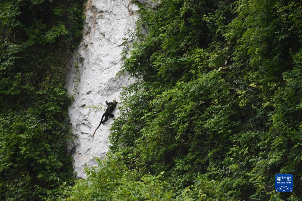 一只白頭葉猴在石壁上攀爬(8月5日攝)。