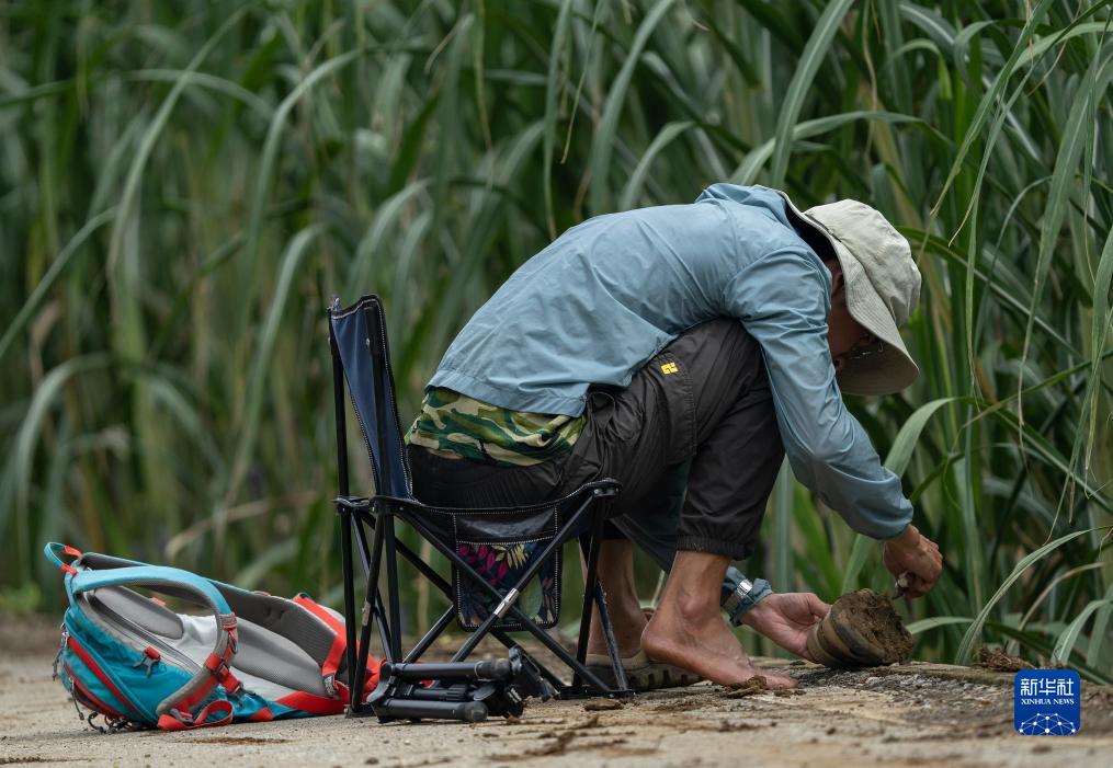 8月5日,李文欽從樹林中出來后,清理沾在鞋上的泥巴。