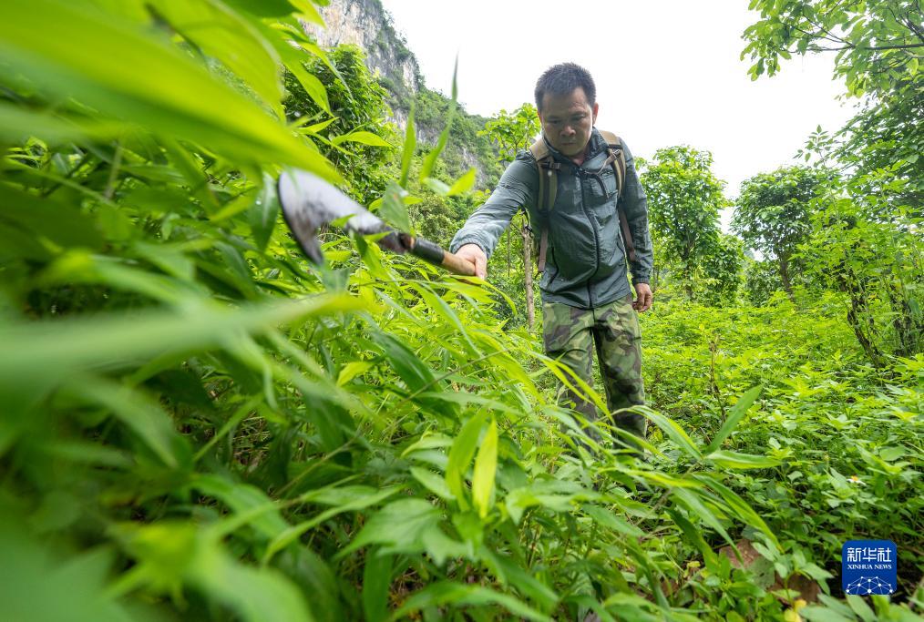8月4日,梁志章在保護區巡視時用砍刀開路。