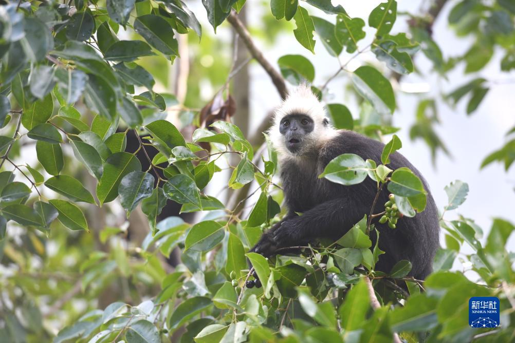 一只白頭葉猴在樹林里覓食(8月5日攝)。