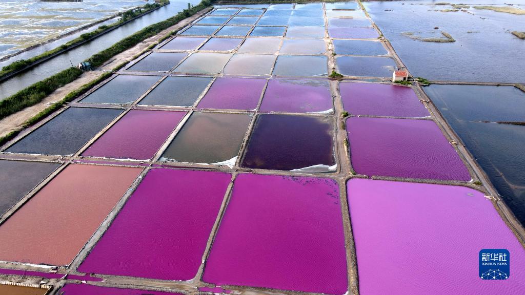 立秋將近,山東省榮成市港西鎮(zhèn)海邊的鹽田在晴空的映襯下呈現(xiàn)出五顏六色的美麗景象。