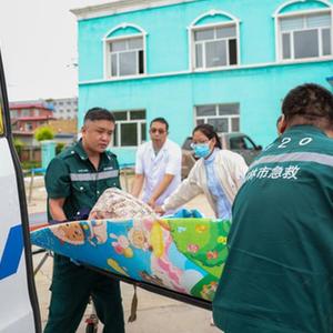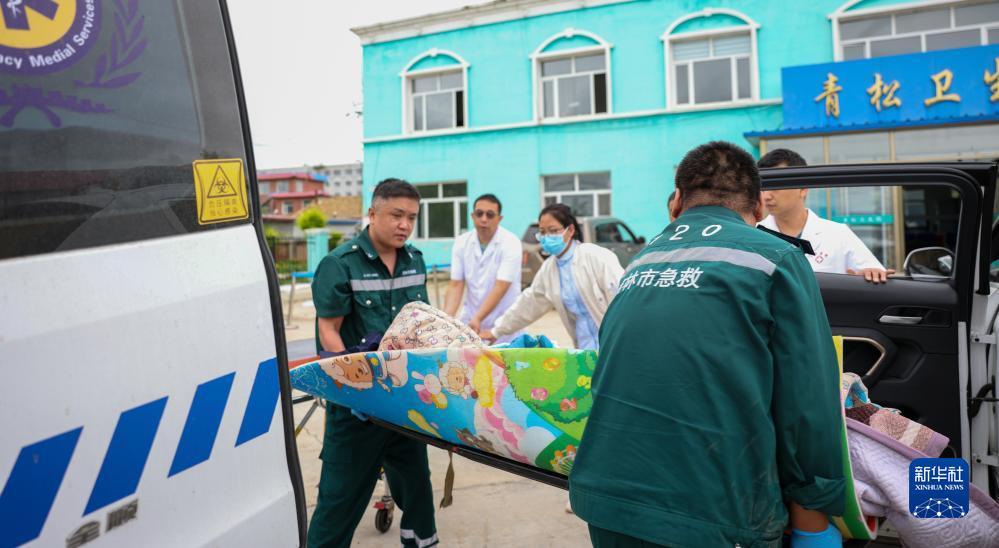 8月6日,舒蘭市青松衛生院醫護人員將受困群眾運送至醫院。
